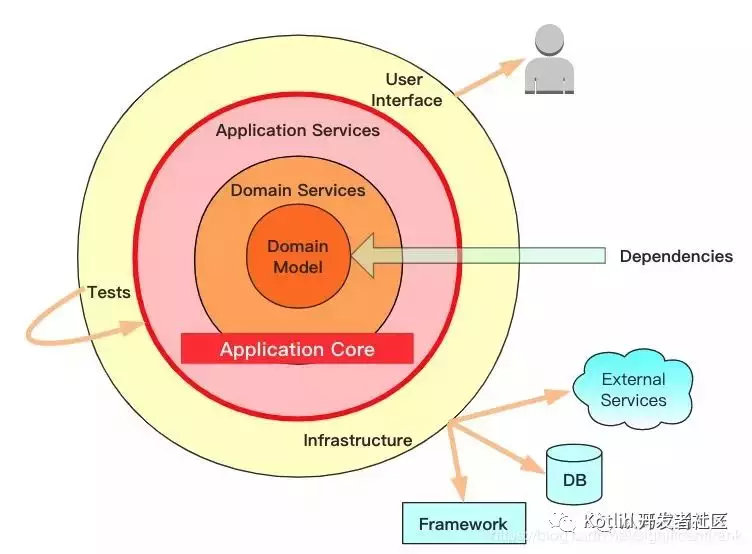 不同的是洋葱架构还告诉我们,企业应用中存在着不止两个层次,它在业务逻辑中加入了一些在领域驱动设计的过程中被识别出来的层次(Application,Domain Service,Domain model,Infrastructure等)