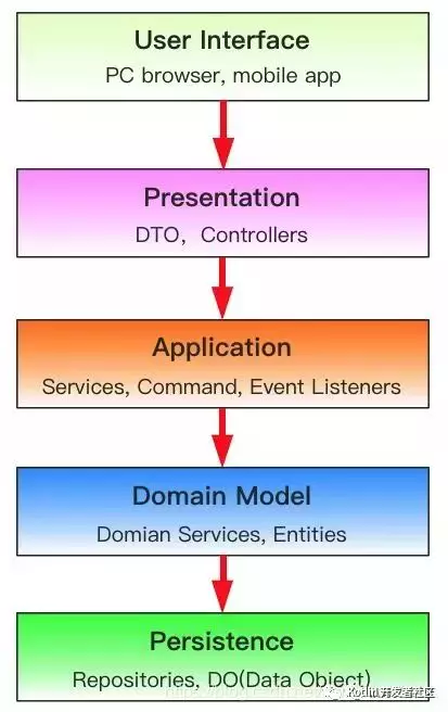 2)应用层(Application Layer):主要负责获取输入,组装上下文,做输入校验,调用领域层做业务处理,如果需要的话,发送消息通知。当然,层次是开放的,若有需要,应用层也可以直接访问基础实施层;