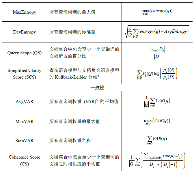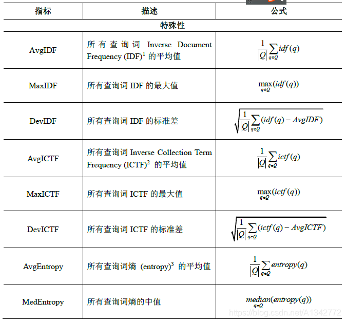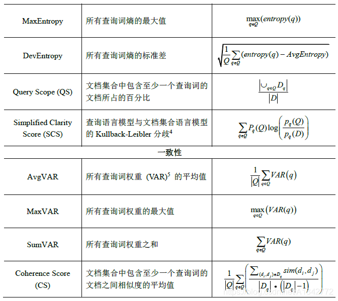 QQ指标在之前的工作中被用于评估查询的质量,这些指标在之前的工作中被用于评估查询的质量。之所以使用这些指标是因为它们补充了基于IR 的特征,并且可以为分类器提供有关两个制品之间追踪链的更多上下文信息。下表展示了这些指标详细的计算公式。