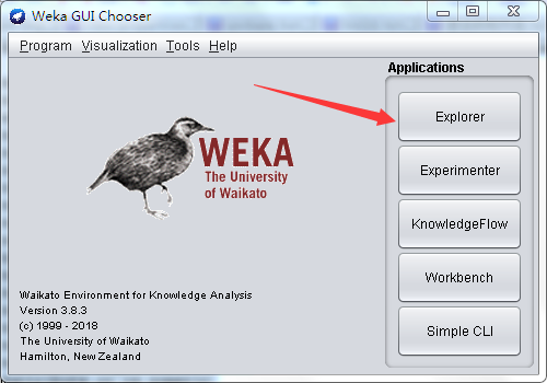 步骤二:打开weka ,点击Explorer按钮,进入主界面
