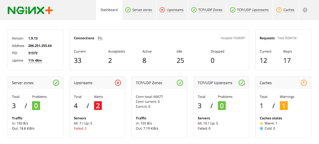 为了帮助用户尽快发现问题,NGINX Plus增加了应用程序体检功能,会报告经常重复出现的问题。NGINX Plus还具备session draining特性,会在已有任务完成前阻止新连接,以及慢启动容量,从而让恢复的服务器在负载均衡集群中达到应有的速度。使用得当的情况下,健康体检会在问题显著影响用户体验之前帮你定位问题,而session draining和慢启动则让你替换服务器时不影响感知的性能和在线时间。这张图展示了NGINX Plus内置的实时活动监控的控制板,涵盖了服务器、TCP连接和缓存。