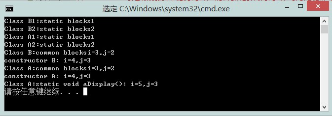 System.out.println("Class A:static void aDisplay(): "+"i="+i+",j="+j);