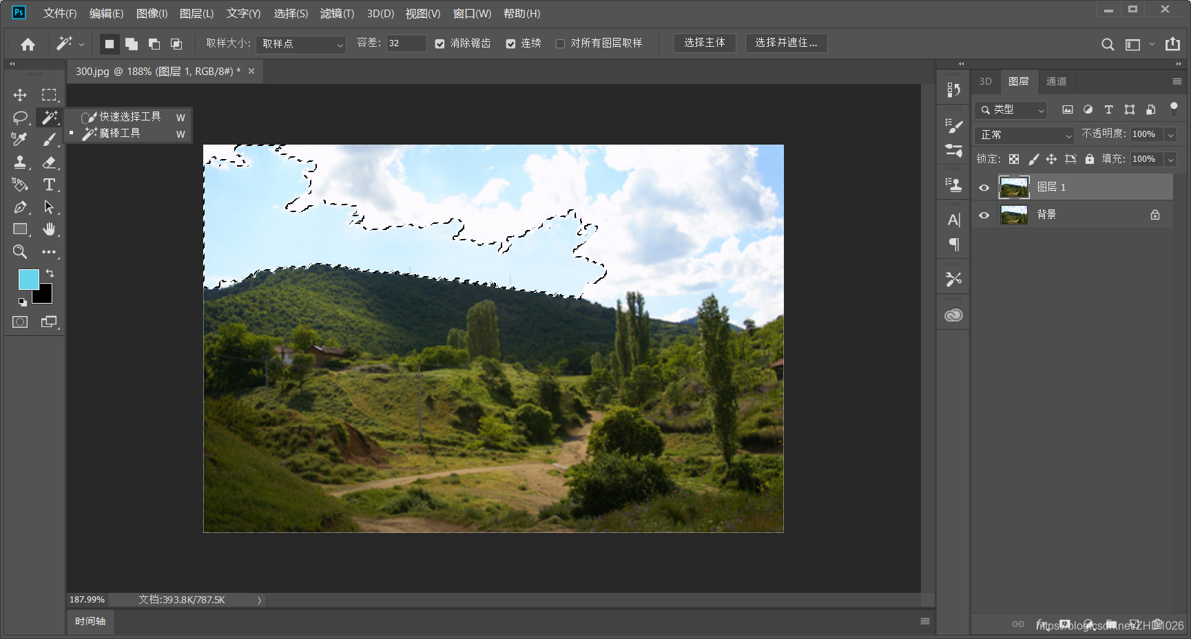魔棒与快速选择工具是建立选区的一大助力,两者会将选中像素点附近相似的像素点全部整合成一个选区,具体位置如图: