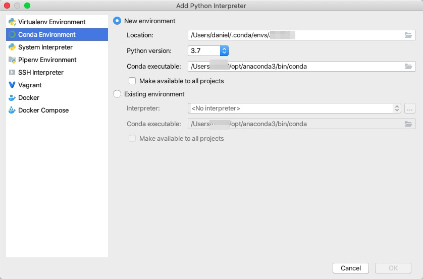 选择 conda 环境,特别要注意的是,conda executable 的路径,是安装路径的下的 bin/conda