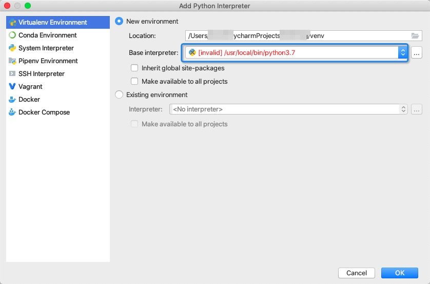 因为我把原来的python3.7干掉了,所以之前的venv环境中,base interpreter 失效,红色提示