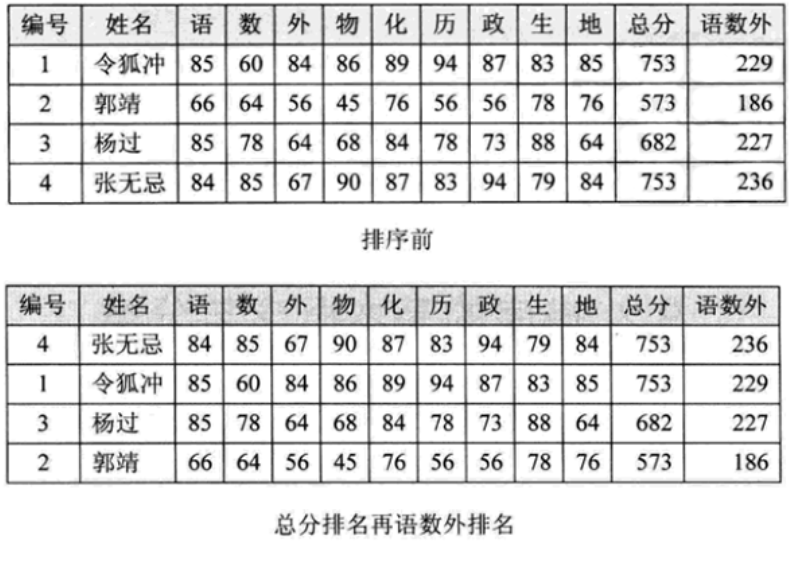 这里关键字 可以是记录 r 的主关键字,也可以是次关键字,甚至是若干数据项的组合。比如我们某些大学为了选拔在主科上更优秀的学生,要求对所有学生的所有科目总分降序排名,并且在同样总分的情况下将语数外总分做降序排名。这就是对总分和语数外总分两个次关键字的组合排序。如下图所示,对于组合排序的问题, 当然可以先排序总分,若总分相等的情况下,再排序语数外总分,但这是比较土的办法。我们还可以应用一个技巧来实现一次排序即完成组合排序问题,例如,把总分与语数外都当成字符串首尾连接在一起( 注意语数外总分如果位数不够三位,需要在前面补零 ),很容易可以得到令狐冲的 “753229” 要小于张无忌的 “753236” ,于是张无忌就排在了令狐冲的前面。