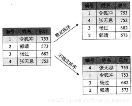 如下图所示,经过对总分的降序排序后,总分高的排在前列。此时对于令狐冲和张无忌而言,未排序时是令狐冲在前,那么它们总分排序后,分数相等的令狐冲依然应该在前,这样才算是稳定的排序,如果他们二者颠倒了,则此排序是不稳定的了。只要有一组关键字实例发生类似情况, 就可认为此排序方法是不稳定的。排序算法是否稳定的,要通过分析后才能得出。