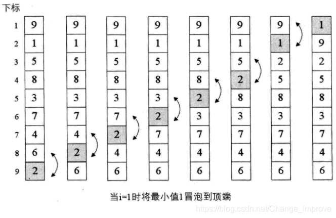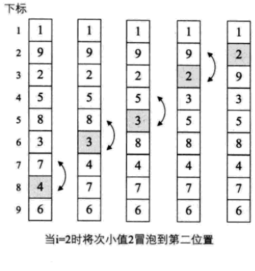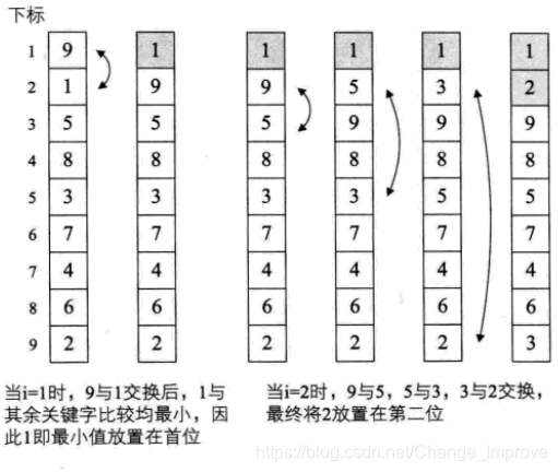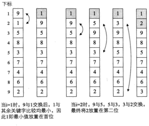 ,当 i=1 时,9 与 1 交换后,在第一位置的 1 与后面的关键字比较都小,因此它就是最小值。当 i=2 时,第二位置先后由 9 换成 5 ,换成 3 ,换成 2 ,完成了第二小的数字交换。后面的数字变换类似,不再介绍。