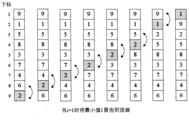 依然假设我们待排序的关键字序列是 { 9, 1, 5, 8, 3, 7, 4, 6, 2} ,当 i=1 时,变量 j 由 8 反向循环到 1 ,逐个比较,将较小值交换到前面,直到最后找到最小值放置在了第 1 的位置。如下图所示,当 i=1、j=8 时,我们发现 6>2 ,因此交换了它们的位置,j=7 时,4>2 ,所以交换 …… 直到 j=2 时,因为 1<2 ,所以不交换。j=1 时,9>1 ,交换, 最终得到最小值 1 放置第一的位置。事实上,在不断循环的过程中,除了将关键字 1 放到第一的位置,我们还将关键字 2 从第九位置提到了第三的位置,显然这一算法比前面的要有进步,在上十万条数据的排序过程中,这种差异会体现出来。图中较小的数字如同气泡般慢慢浮到上面,因此就将此算法命名为冒泡算法。