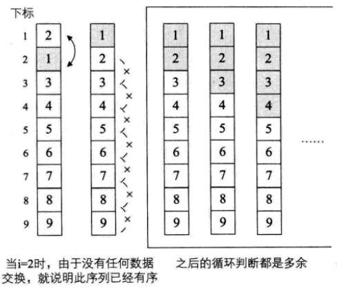 这样的冒泡程序是否还可以优化呢?答案是肯定的。试想一下,如果我们待排序的序列是 { 2, 1, 3, 4, 5, 6, 7, 8, 9 } ,也就是说,除了第一和第二的关键字需要交换外,别的都已经是正常的顺序。当 i=1 时,交换了 2 和 1 ,此时序列已经有序,但是算法仍然不依不饶地将 i=2 到 9 以及每个循环中的 j 循环都执行了一遍,尽管并没有交换数据,但是之后的大量比较还是大大地多余了,如下图所示。