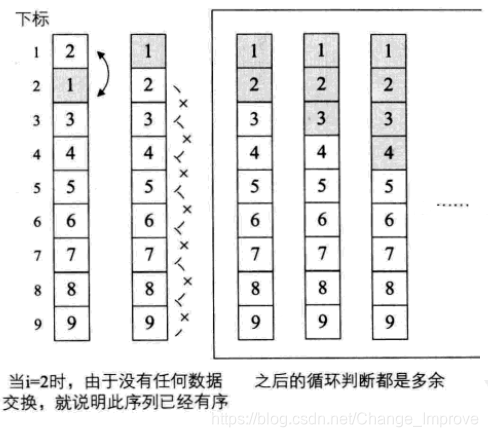 当 i=2 时,我们已经对 9 与 8 , 8 与 7 ,…… ,3 与 2 作了比较,没有任何数据交换,这就说明此序列已经有序,不需要再继续后面的循环判断工作了。为了实现这个想法,我们需要改进一下代码,增加一个标记变量 flag 来实现这一算法的改进。