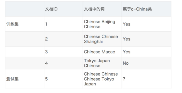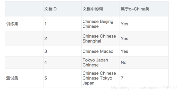 需求:通过前四个训练样本(文章),判断第五篇文章,是否属于China类