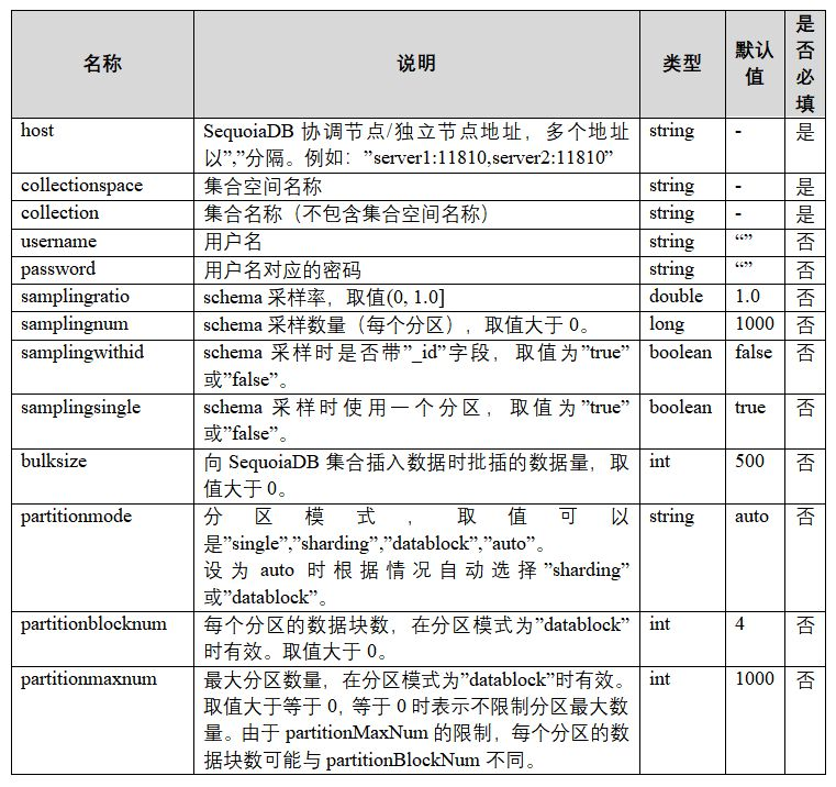 SparkSQL for SequoiaDB 的建表 options 参数列表如下: