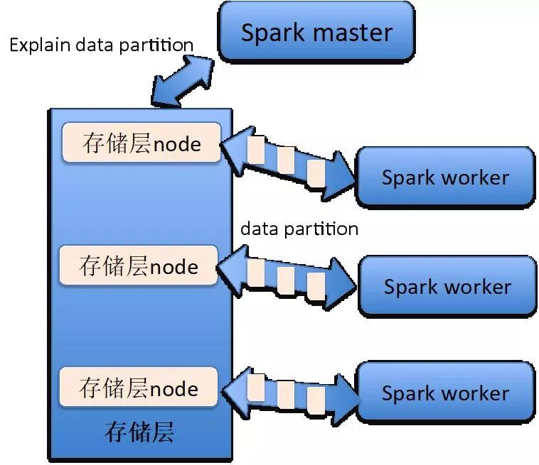 Spark 计算框架与存储层的关系,可以从下图中了解其原理。Spark master 在接收到一个计算任务后,首先会与存储层做一次通讯,从存储层的访问快照或者是存储规划中,得到本次计算任务所设计的所有数据的存储情况。存储层返回给 Spark master 的结果为数据存储的 partition 队列。