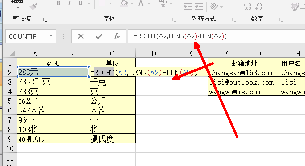 =RIGHT(A2,LENB(A2)-LEN(A2))