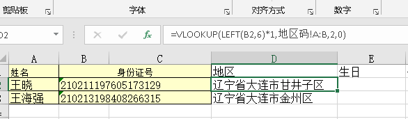 =VLOOKUP(LEFT(B2,6)*1,地区码!A:B,2,0)