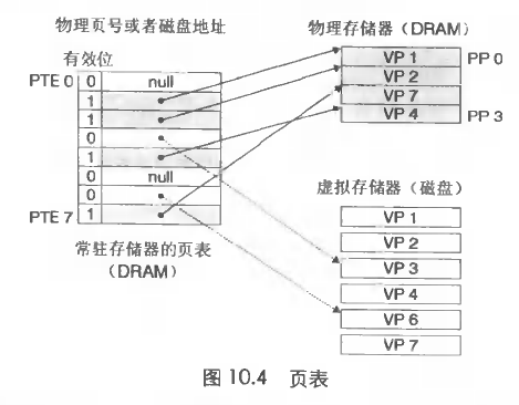 上面提到了页表,页表是存储在DRAM中的一个数据结构,完成虚拟页到物理页的映射。虚拟存储器/页表/物理存储器之间的映射关系如下:
