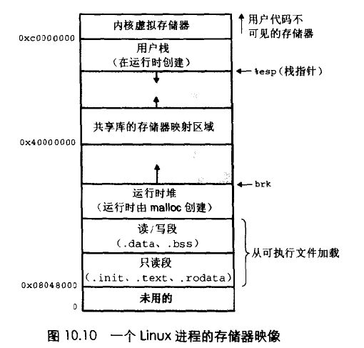 每个进程都有相同格式的内存分配,不管代码和数据实际存储在物理存储器的何处,每个linux进程都使用如下格式: