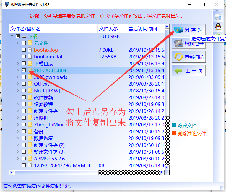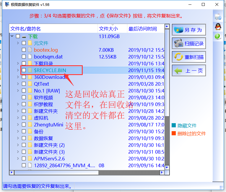 步骤3:软件会很快将找出的数据,都在《$RECYCLE.BIL》或《$RECYCLE》中($RECYCLE这个文件是回收站在里面的真正文件名)。