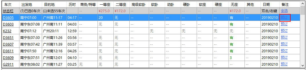 这些就是你可以选择的车次信息了。是按开车时间顺序排列的。假如你想买 D3605 这趟车,可以点击这一行最右边的“预订”(也可以鼠标双击该行)。此时在下方“已选车次”小框内就出现了该车次,证明已选中。