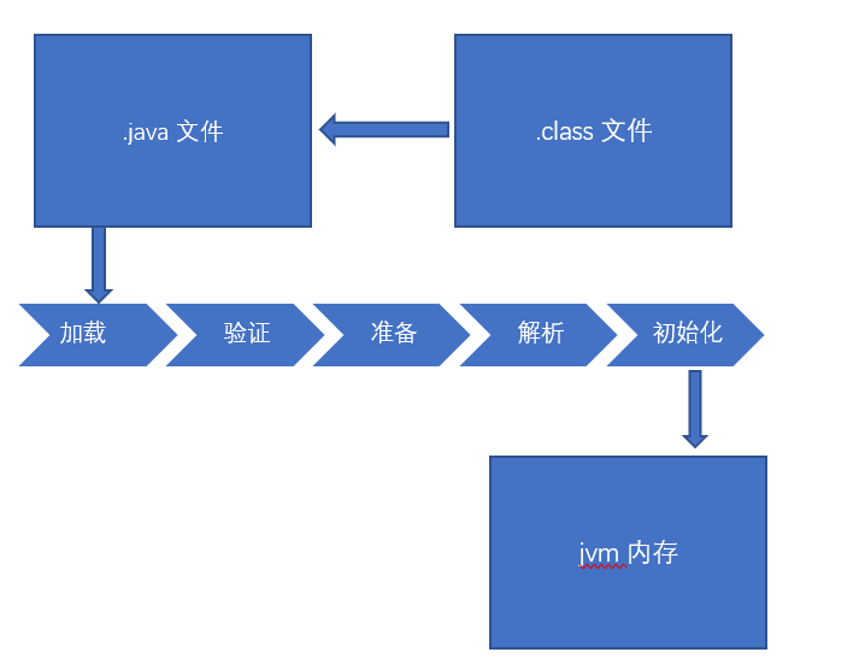 我们平时所编写的“xx.java”文件需要经过我们所知的java编译器(javac)编译成“xx.class”文件,这个文件存放着编译后jvm指令的的二进制信息。而**当我们需要用到某个类时,jvm将会加载它,并在内存中创建对应的class对象,这个过程称之为类的加载。**过程如下:
