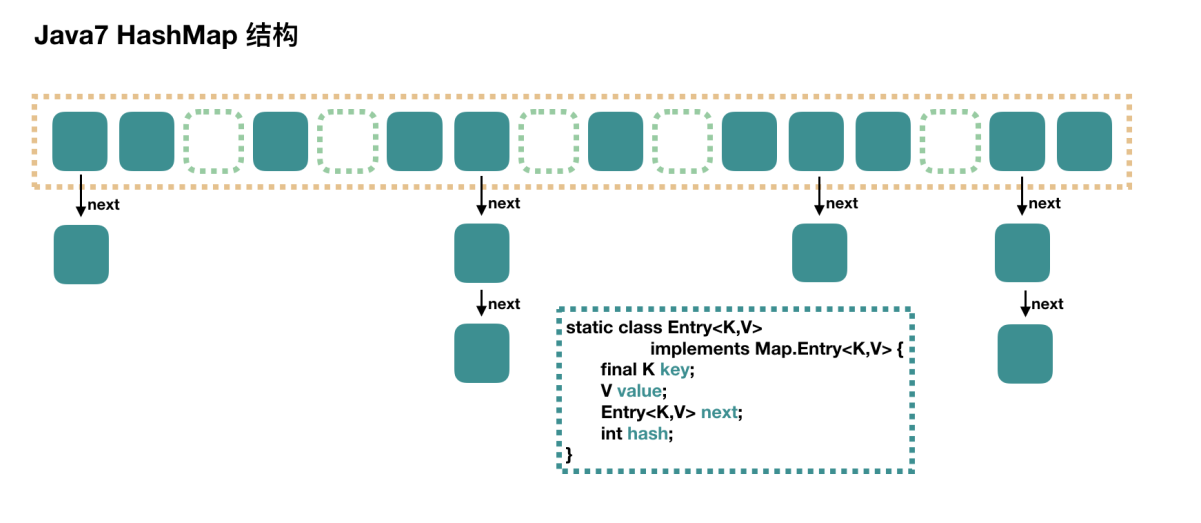的实体是嵌套类 Entry 的实例, Entry 包含四个属性: key, value, hash 值和用于单向链表的 next。