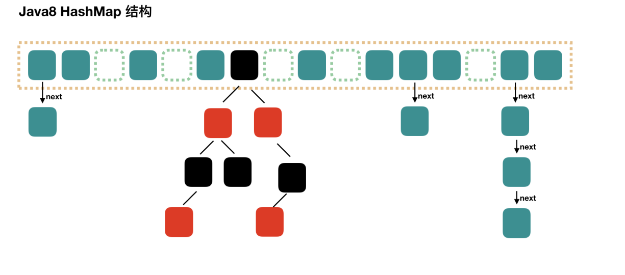 大方向上, HashMap 里面是一个数组,然后数组中每个元素是一个单向链表。上图中,每个绿色