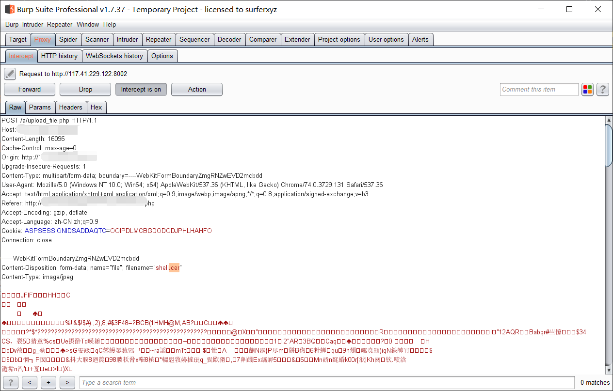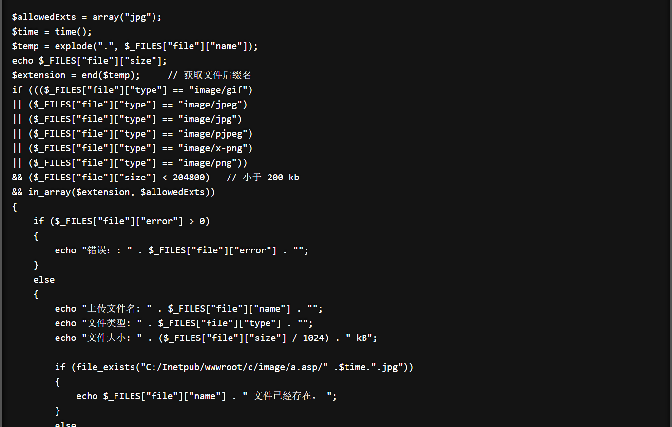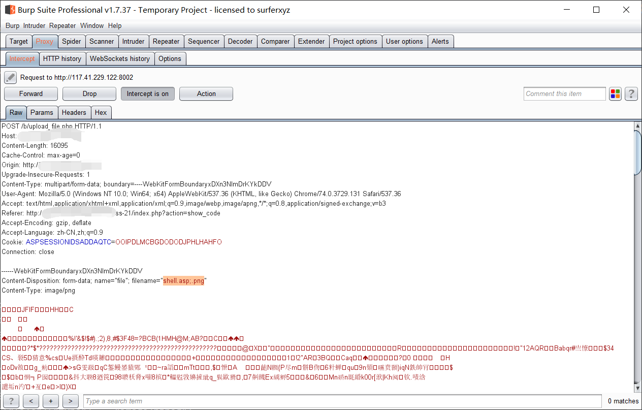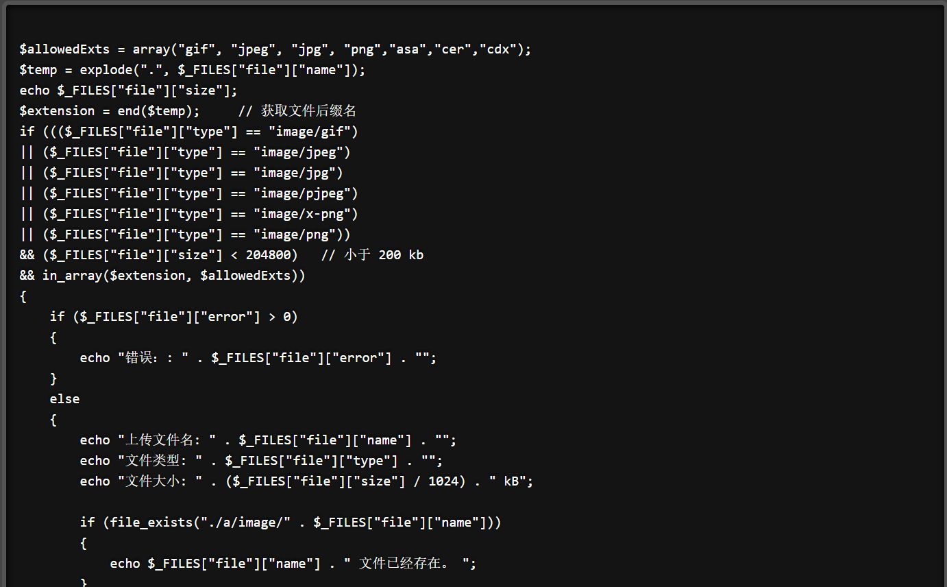 这题做法只需上传一张做好的asp一句话图片然后抓包,修改后缀为.cer或.asa或.cdx,即可