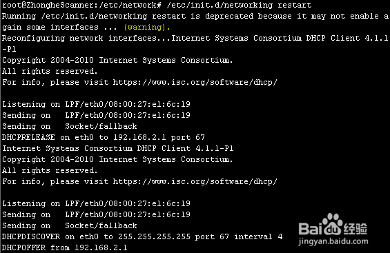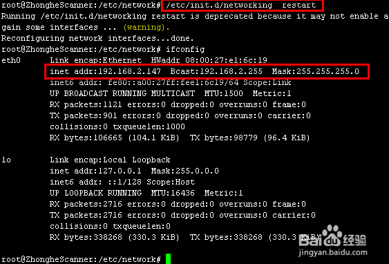 使用“/etc/init.d/networking restart”命令使用网卡配置文件内容生效,并使用“ifconfig”命令查看网卡eth0网卡的ip地址。