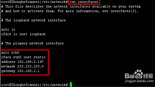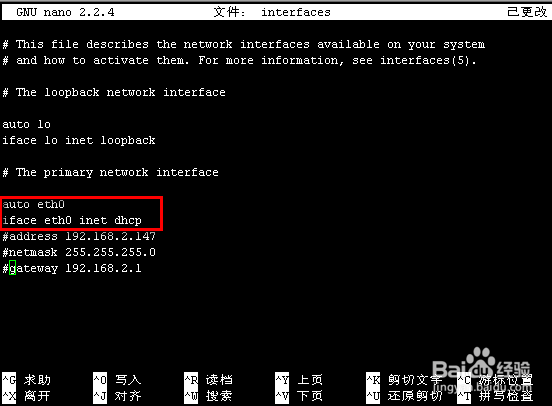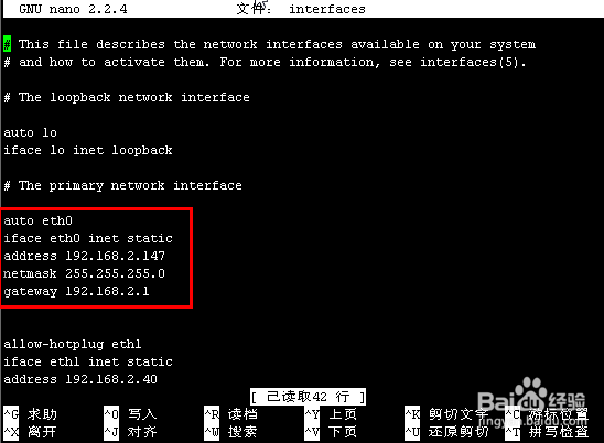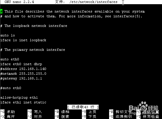 使用nano编辑器或者vim编辑器,编辑网卡配置文件(interfaces),在当前目录下执行命令"nano interfaces"即可编辑网卡配置文件的内容。