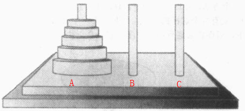 汉诺塔问题是由很多放置在三个塔座上的盘子组成的一个古老的难题。如下图所示,所有盘子的直径是不同的,并且盘子中央都有一个洞使得它们刚好可以放在塔座上。所有的盘子刚开始都放置在A 塔座上。这个难题的目标是将所有的盘子都从塔座A移动到塔座C上,每次只可以移动一个盘子,并且任何一个盘子都不可以放置在比自己小的盘子之上。