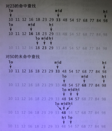 在有序数组array[]中,不断将数组的中间值(mid)和被查找的值比较,如果被查找的值等于array[mid],就返回下标mid; 否则,就将查找范围缩小一半。如果被查找的值小于array[mid], 就继续在左半边查找;如果被查找的值大于array[mid], 就继续在右半边查找。 直到查找到该值或者查找范围为空时, 查找结束。