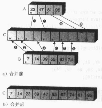 归并算法的中心是归并两个已经有序的数组。归并两个有序数组A和B,就生成了第三个有序数组C。数组C包含数组A和B的所有数据项。