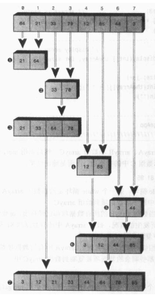 把每一半都分为四分之一,对每个四分之一进行排序,然后把它们归并成一个有序的一半。类似的,如何给每个四分之一数组排序呢?把每个四分之一分成八分之一,对每个八分之一进行排序,以此类推,反复的分割数组,直到得到的子数组是一个数据项,那这就是这个递归算法的边界值,也就是假定一个数据项的元素是有序的。