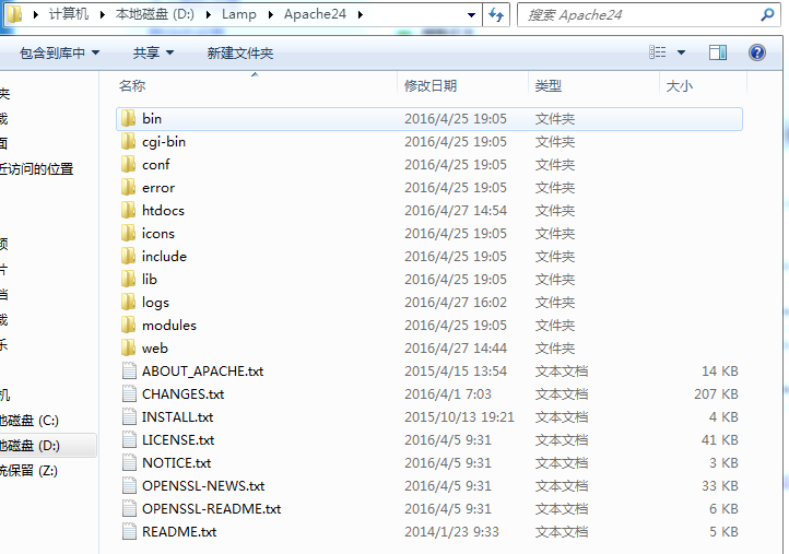 1.2 解压到指定位置,并重命名为Apache24,目录结构如下图:
