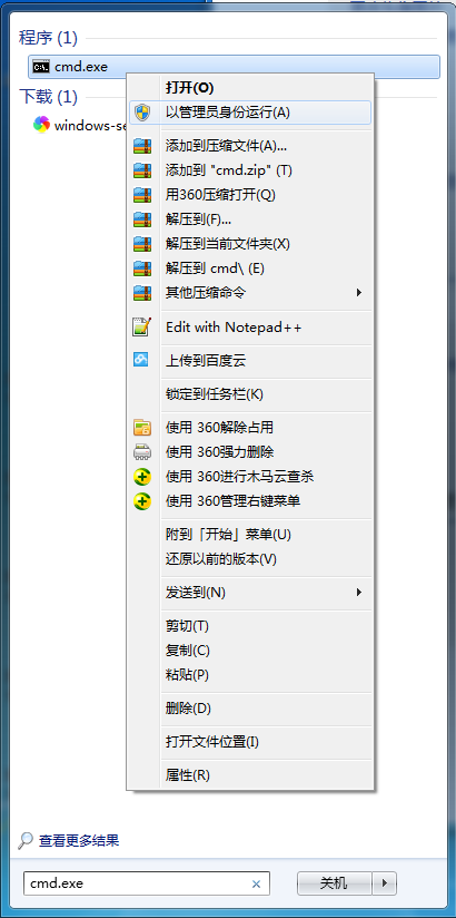 在开始菜单中搜索cmd.exe,并鼠标右键以管理员身份打开