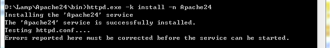 命令:httpd.exe -n Apache24 -t #在启动服务前,检查Apache配置,-h 查看帮助 ,-k start 启动服务