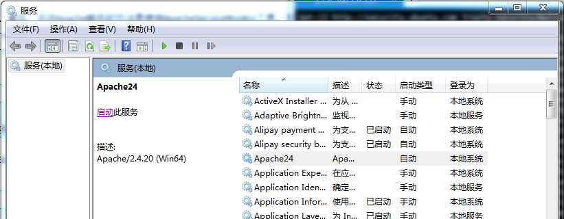 通常,启动、重启、关闭Apache服务的方法是使用ApacheServiceMonitor工具,另外也可以使用控制台命令:net start Apache24(下图) 和net stop Apache24或者通过Windows服务控制面板(上图)。