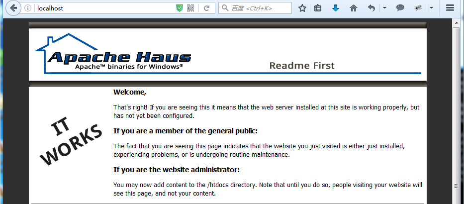 打开浏览器,在地址栏中输入:localhost或127.0.0.1,即可查看Apache提供的默认页面。
