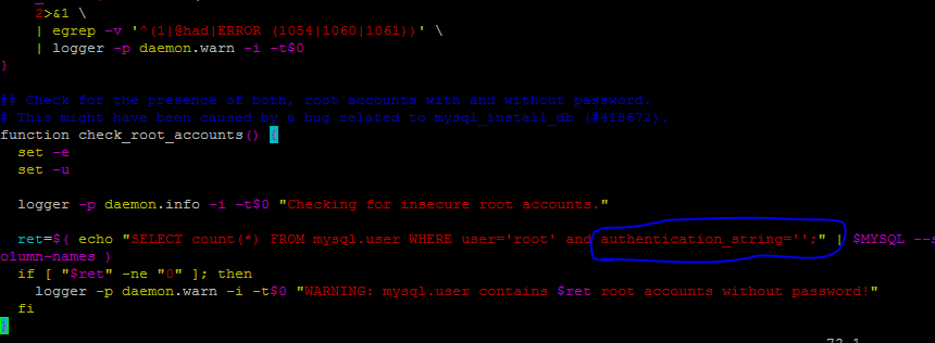 原因分析:这是在做启动mysql的一个root账户检查,但是由于5.7以后mysql.user表中的password字段被修改为了authentication_string,但是这个sql语句并没有更改,所以报错。。。。