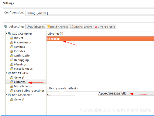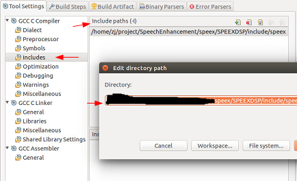 添加Include链接:Project->Property->C/C++ Build->Setting->Tool Settings->GCC C Compiler->Includes,将编译好的include/speex目录放进来。