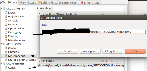 添加静态库:Project->Property->C/C++ Build->Setting->Tool Settings->GCC C Linker->Miscellaneous->other Objects:在文件系统中找到**.a加入。这里添加静态库编译没有通过,动态库才通过。