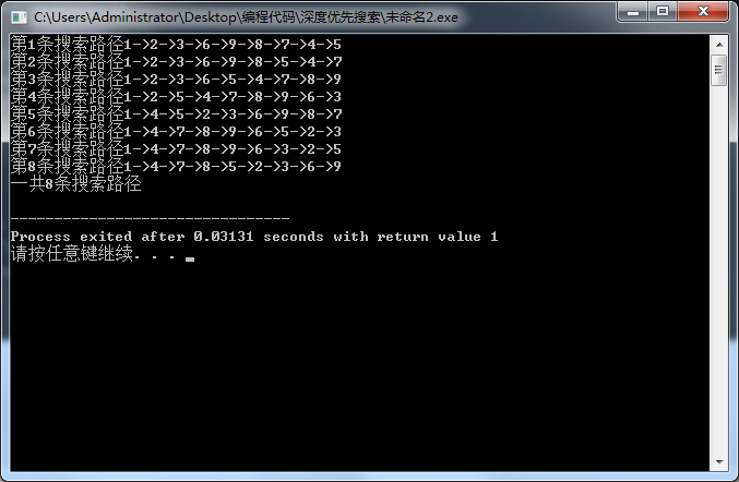 #include<iostream> using namespace std; int a[3][3]={{1,2,3},{4,5,6},{7,8,9}}; int book[3][3]={0}; int next[4][2]={0,1,1,0,0,-1,-1,0};//搜索顺序右下左上 int sum=0; void dfs(int x,int y,int step,string s) { if(step==9) { sum++; cout<<"第"<<sum<<"条搜索路径"<<s<<endl;; return ; } for(int i=0;i<4;i++) { int tx=x+next[i][0]; int ty=y+next[i][1]; if(tx<0||tx>=3||ty<0||ty>=3) continue; if(book[tx][ty]==1) continue; book[tx][ty]=1; dfs(tx,ty,step+1,s+"->"+char('0'+a[tx][ty])); book[tx][ty]=0; } } int main() { book[0][0]=1; dfs(0,0,1,"1"); cout<<"一共"<<sum<<"条搜索路径"<<endl; return 1; }运行结果: