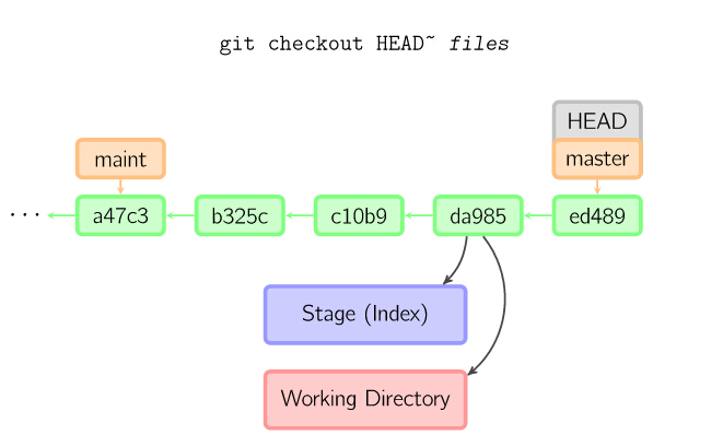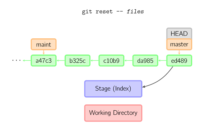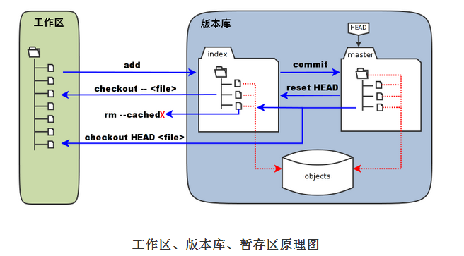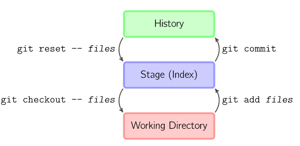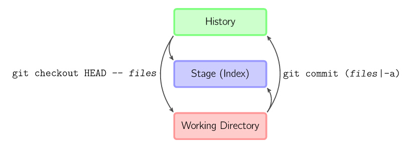 git add files把当前文件放入暂存区域。git commit给暂存区域生成快照并提交。git reset -- files用来撤销最后一次git add files,你也可以用git reset撤销所有暂存区域文件。(操作对象是HEAD)git checkout -- files把文件从暂存区域复制到工作目录,用来丢弃本地修改。(目的是working Directory)