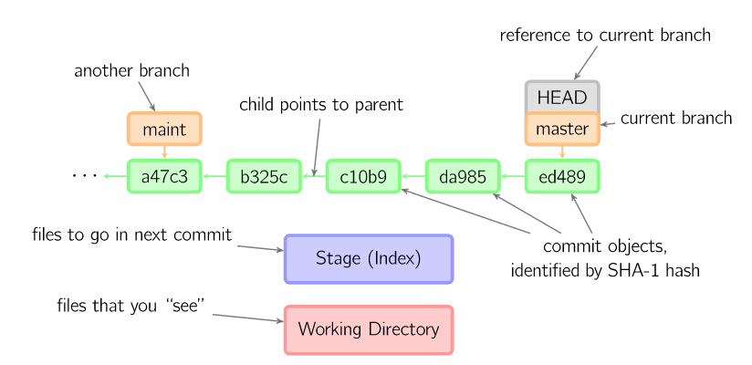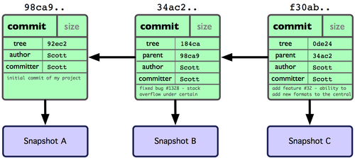 git中文件内容并没有真正存储在索引(.git/index)或者提交对象中,而是以blob的形式分别存储在数据库中(.git/objects),并用SHA-1值来校验。 索引文件用识别码列出相关的blob文件以及别的数据。对于提交来说,以树(tree)的形式存储,同样用对于的哈希值识别。树对应着工作目录中的文件夹,树中包含的 树或者blob对象对应着相应的子目录和文件。每次提交都存储下它的上一级树的识别码。