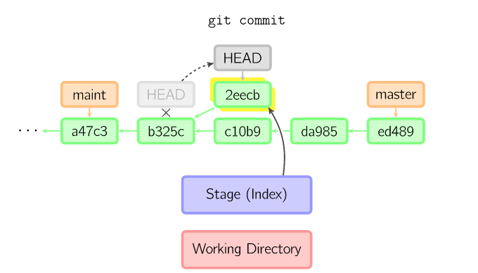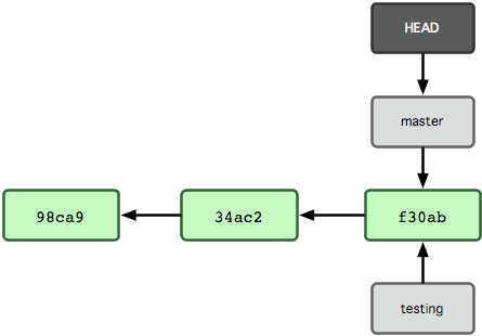一旦此后你切换到别的分支,比如说master,那么这个提交节点(可能)再也不会被引用到,然后就会被丢弃掉了。注意这个命令之后就不会有东西引用2eecb。