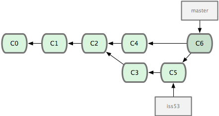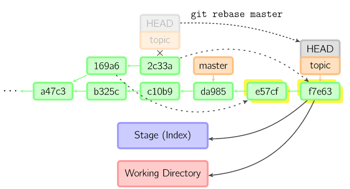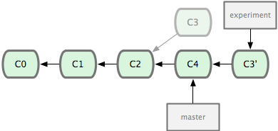 上面的命令都在topic分支中进行,而不是master分支,在master分支上重演,并且把分支指向新的节点。注意旧提交没有被引用,将被回收。