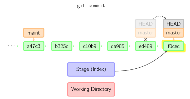 提交时,git用暂存区域的文件创建一个新的提交,并把此时的节点设为父节点。然后把当前分支指向新的提交节点。下图中,当前分支是master。 在运行命令之前,master指向ed489,提交后,master指向新的节点f0cec并以ed489作为父节点