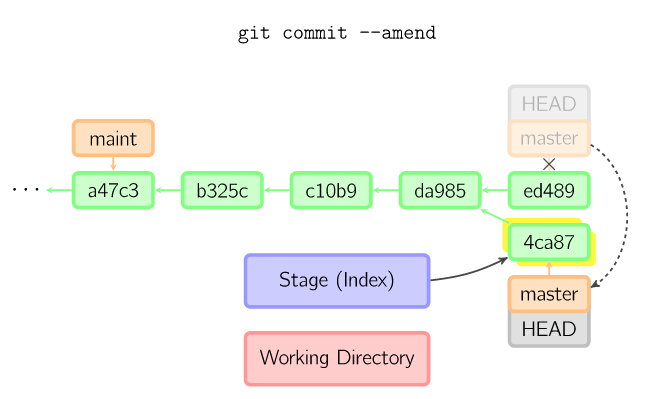 如果想更改一次提交,使用 git commit --amend。git会使用与当前提交相同的父节点进行一次新提交,旧的提交会被取消