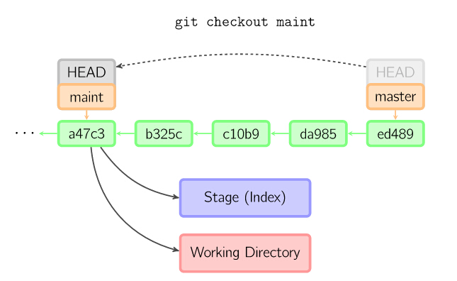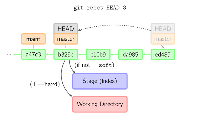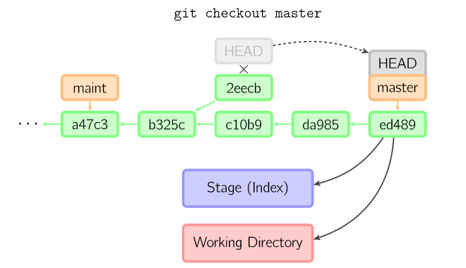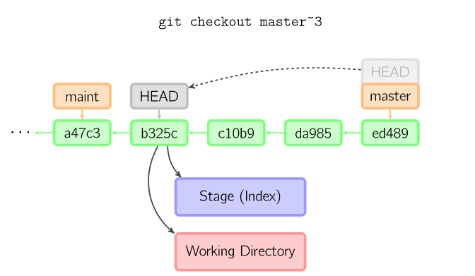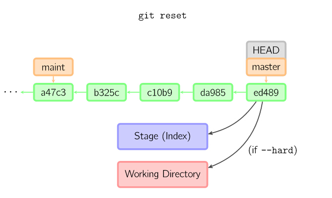 如果没有给出提交点的版本号,那么默认用HEAD。这样,分支指向不变,但是索引会回滚到最后一次提交,如果用--hard选项,工作目录也同样。(=== checkout )